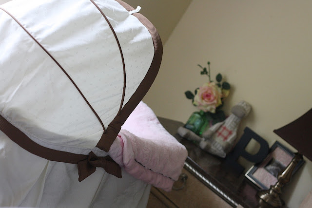Really, all I did was add the bassinet, remove all my bedside crap and add some of hers. I bought the letter P to wrap it in yarn like all the crafty mama’s do but the beautiful pink and white yarn that I got (on sale) is missing. We’ve searched high and low and I suppose I’ll have to go find more.