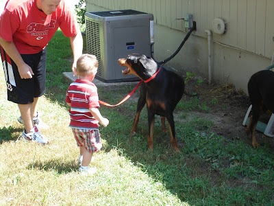 Matthew and the dogs get along awesome, even Halle enjoys him. But this last visit he has taken his love for dogs and confused it a bit with his love of horses. He can say “dog” and “horsey” very clearly and its obvious that he knows the difference, but he hasn’t quite grasped all their differences. He started walking over to the dogs and lifting up his leg, or standing next to them and jumping, and after a while we realized what it is he was trying to do; he was trying to ride the dogs. Then the funniest part, he would grab his blanket and lay it over their back before trying to jump, like he was placing a saddle on them. Its fun to watch them think and learn and mimic things they’ve seen.